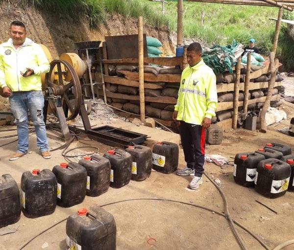 En el inventario de lo hallado constan: 25 canecas de ácido nítrico, 34 sacos de bórax de 25 kg, 14 sacos de cianuro de potasio y un motor.