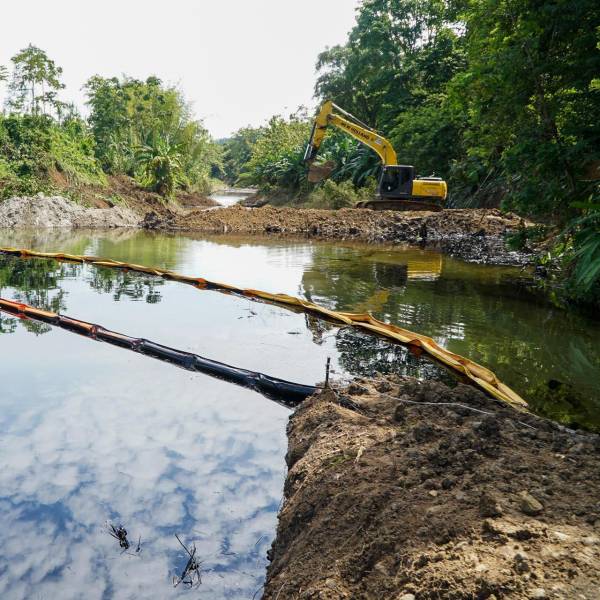 Nuevas actividades se coordinan en la fase de remediación y compensación tras las intensas lluvias registradas en Esmeraldas que comprometieron el dique de contención de petróleo en el río Caple.
