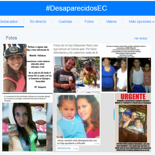 Tras el terremoto de ayer 16 de abril del 2016, en redes sociales como Facebook y Twitter se activó con el Hashtag #DesaparecidosEC. Mediante esta etiqueta se pretende obtener información de personas que aún no se han comunicado con sus allegados luego del sismo que sacudió al país.