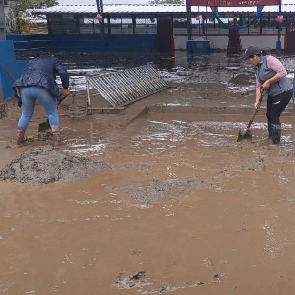 Respecto a las escuelas, el Ministerio de Educación informó que realiza la limpieza del lodo en las instituciones educativas Juan Bautista Montini y EEGB Guillermo Vinueza. Asimismo, se evalúa los daños en infraestructura, materiales educativos y alimentación escolar.