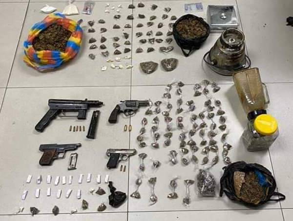 Entre las evidencias hay 4 armas, municiones, 600 dosis de marihuana y cocaína.