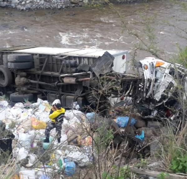 Dos vehículos de carga chocaron y cayeron a un precipicio de 12 metros.