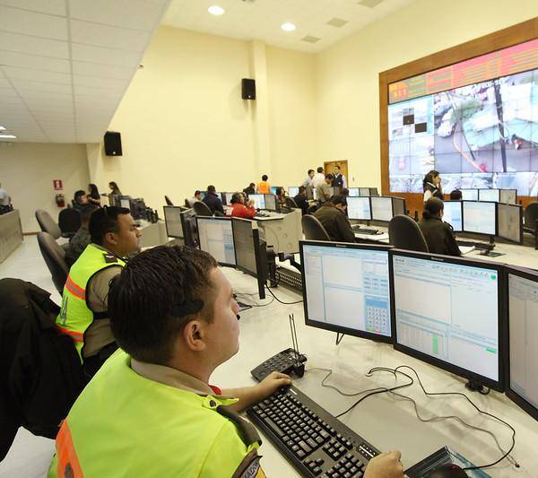 Miembros de la Policía Nacional y de otros cuerpos de vigilancia monitorean las cámaras desde el ECU 911.( )