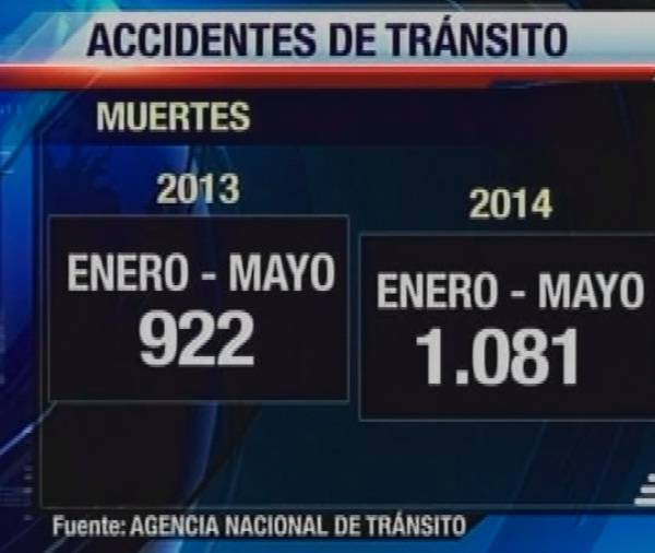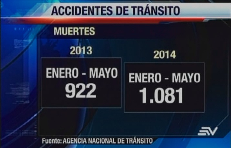 Desde enero hasta mayo de 2014 se han registrado 1.081 muertes en el Ecuador por accidentes de tránsito, cifra que se ubicó en 922, en el mismo periodo de 2013.