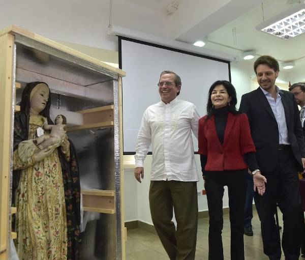 Durante la rueda de prensa las autoridades abrieron una de las cajas que contenía una imagen tallada de madera de Santa Rosa de Lima y recorrieron una exhibición temporal donde estaban cuadros, altares, atriles e imágenes religiosas de madera.