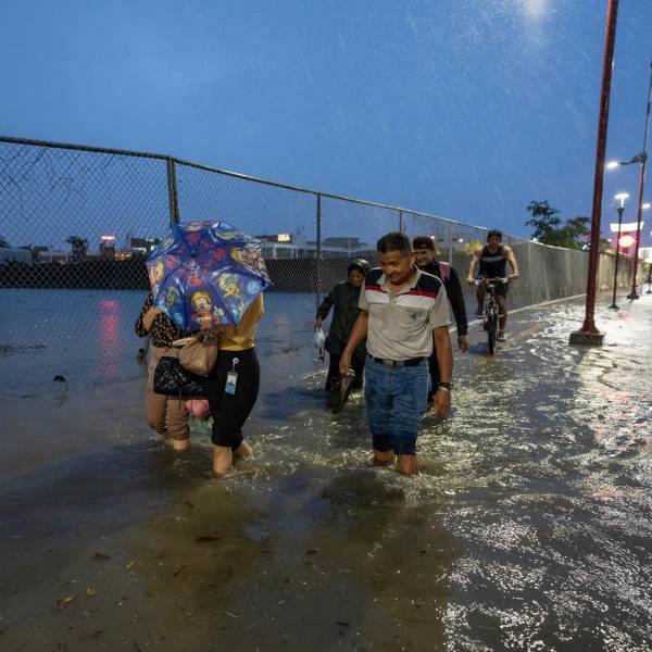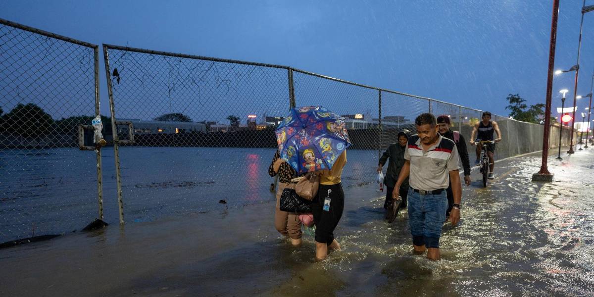 Foto del pasado 20 de febrero, en la que se registró a un grupo de personas al caminar por una vía inundada. ( )