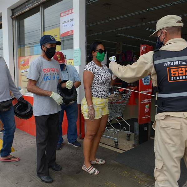 Pie: Un agente de seguridad revisa a compradores antes de entrar en una tienda de alimentos en Daule. Foto: EFE