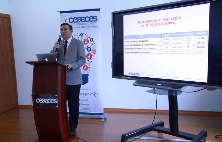 Los resultados del procedimiento determinaron que la Universidad Católica de Cuenca asciende a categoría “B”; mientras que la U. Laica Eloy Alfaro de Manabí, U. Técnica Luis Vargas Torres de Esmeraldas y Universidad Agraria del Ecuador subieron al rango “C”.