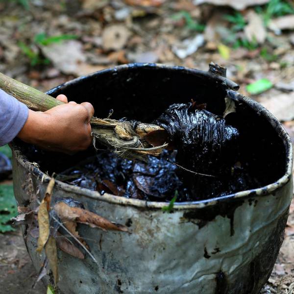 Indígenas de la comunidad de Amarumesa mostraban residuos de petróleo en un recipiente en la ciudad Francisco de Orellana. ( )