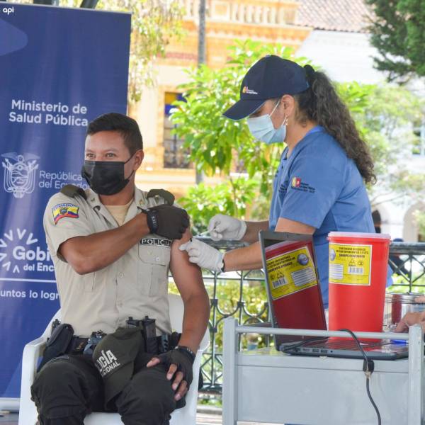 Imagen de archivo de un policía recibiendo una dosis de refuerzo de la vacuna contra el COVID-19, en Cuenca.( )