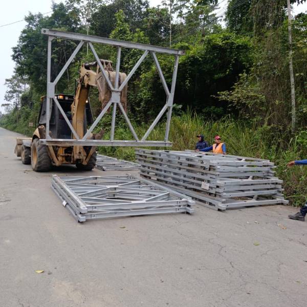 Trabajadores instalan partes de un puente Bailey sobre el río Mollopongo. ( )
