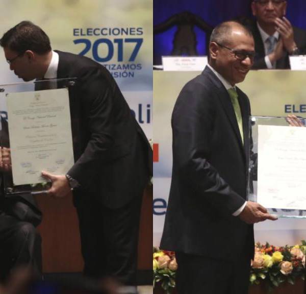 QUITO, Ecuador.- Lenín Moreno y Jorge Glas reciben del CNE las credenciales como los nuevos mandatarios. Fotos: API