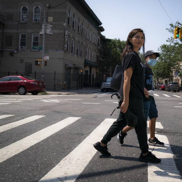 Mónica Muquinche y su hijo Sebastián caminan hacia un parque en su vecindario en el distrito de Brooklyn de Nueva York, el jueves 26 de agosto de 2021. Muquinche, cuyo esposo desapareció en 2020 mientras intentaba llegar a Estados Unidos, es parte de una ola extraordinaria de ecuatorianos que vienen a Estados Unidos. (AP Foto/John Minchillo)( )