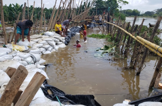 A la intemperie y junto a la carretera viven cerca de 200 familias en el recinto San Vicente de Vinces, provincia de Los Ríos, tras la crecida del río Pocas.
