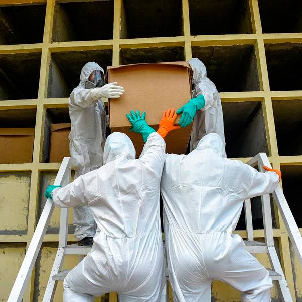 Trabajadores de un cementerio ingresan un cofre en una bóveda. Foto: Archivo
