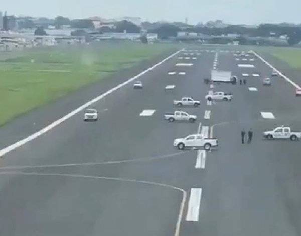 Imagen que muestra el momento cuando avión pretendía aterrizar, pero los vehículos municipales estaban estacionados en la pista.