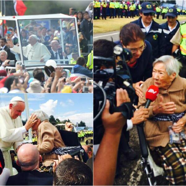 Policías ecuatorianos y miembros del equipo de seguridad del pontífice juntaron sus fuerzas para elevar a Laura Camacho de Rueda, la adulta mayor que estaba en su silla de ruedas, hasta Francisco, quien la recibió con una sonrisa, le dio un beso en la frente, la bendijo y le dijo unas palabras.