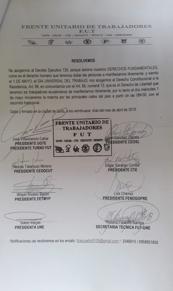 En una nueva rueda de prensa, este 29 de abril de 2019, José Villavicencio, presidente del FUT, leyó un comunicado que, entre otras cosas, señala: "no acogemos el decreto Ejecutivo 726, porque lesiona nuestros derechos fundamentales", refiriéndose a las manifestaciones programdas para ese día.