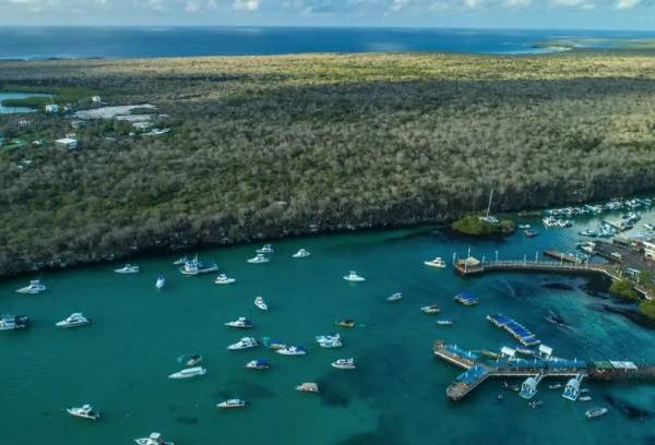 Vista aérea de la bahía de Puerto Ayora en la isla Santa Cruz. Foto: AFP