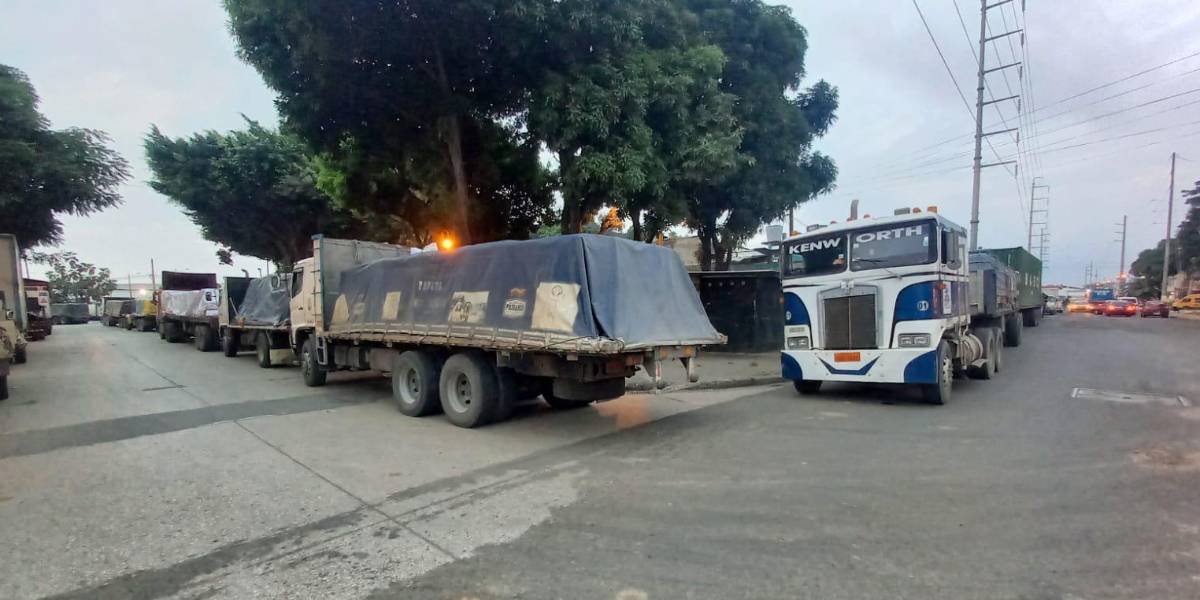 Este viernes decenas de vehículos pesados que transportaban materiales de construcción esperaban en los exteriores de la terminal portuaria de La Pradera, en el sur de Guayaquil.( )