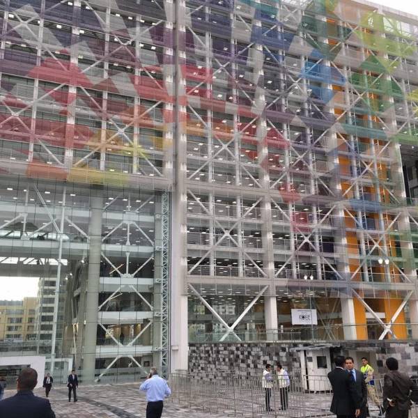 El edificio, que tiene un área de terreno de 53.626 m2 y de construcción, 130.413 m2, dispone además de un auditorio y de 537 parqueaderos, precisamente la zona que sufrió los estragos de las lluvias en la capital.