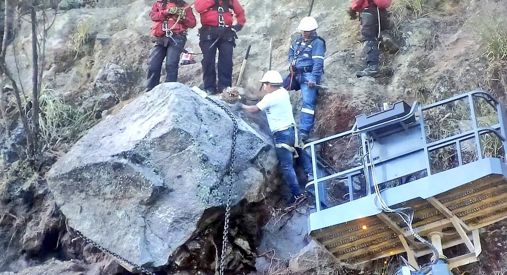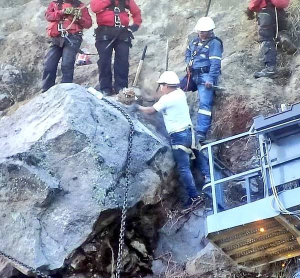 Tras 10 horas de trabajo, finalmente la inmensa roca ubicada en un talud de la avenida Simón Bolívar fue desprendida. Para aflojarla se utilizaron picos, barras, taladros hidráulicos y chorros de agua a presión. Finalmente, con la ayuda de unos picapedreros la roca se desprendió.