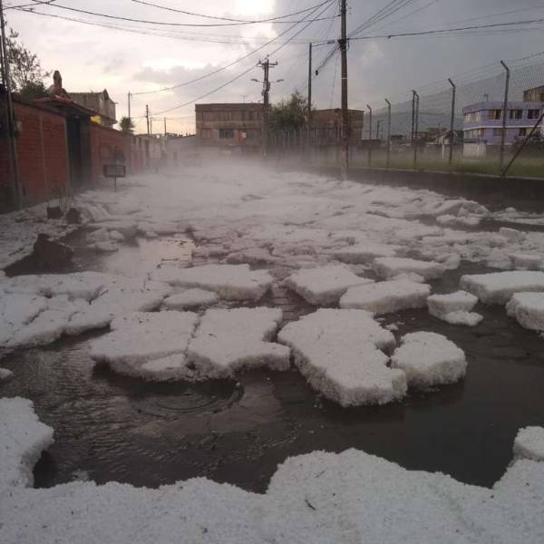 Lluvia y granizo cayeron con fuerza durante cerca de una hora en el cantón Rumiñahui, en la provincia de Pichincha. Los habitantes contemplaron desde las ventanas cómo un manto blanco cubría las calles, patios y por supuesto los techos de las viviendas.