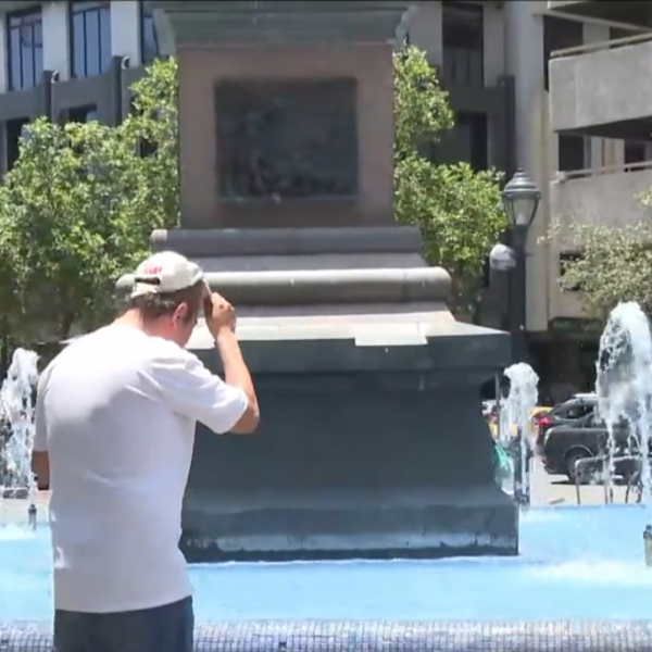 Foto de una persona quitándose la gorra para mojar su cabeza con agua de la fuente enfrente de la Iglesia La Merced, en el centro de Guayaquil, en marzo de 2024.( )