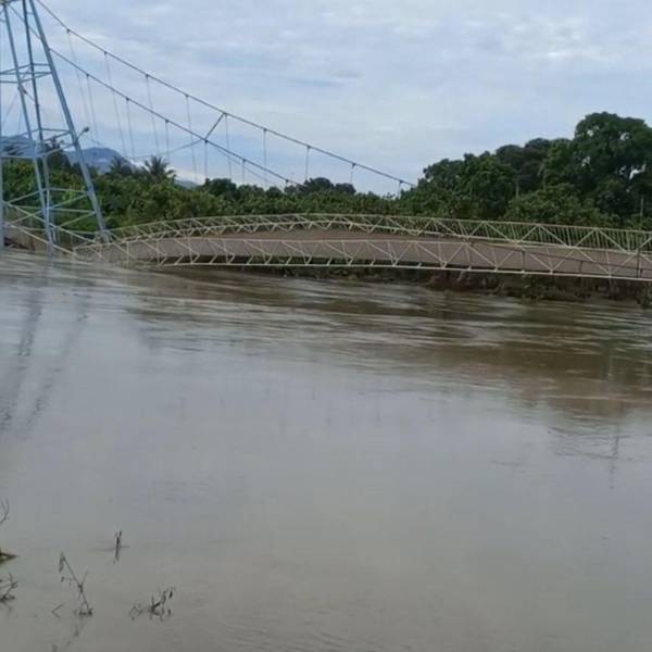 Ha vista de decenas de espectadores, el puente sobre el Río Cristal, en Montalvo, provincia de Los Ríos, colapsó en una de sus bases, al ceder la tierra por el caudal. La estructura se desplomó hacia un lado.
