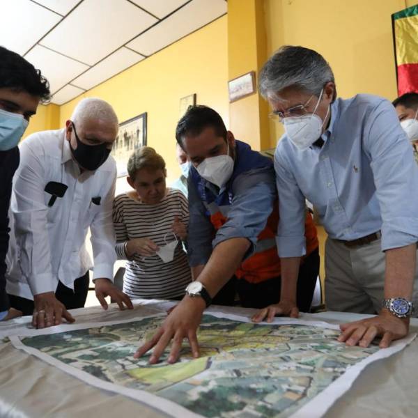 A su arribo a Zaruma, el Jefe de Estado tuvo una reunión con el Puesto de Mando Unificado, en la que se revisó la situación y se analizaron las acciones ya emprendidas y las próximas a ejecutarse para atender la emergencia.
