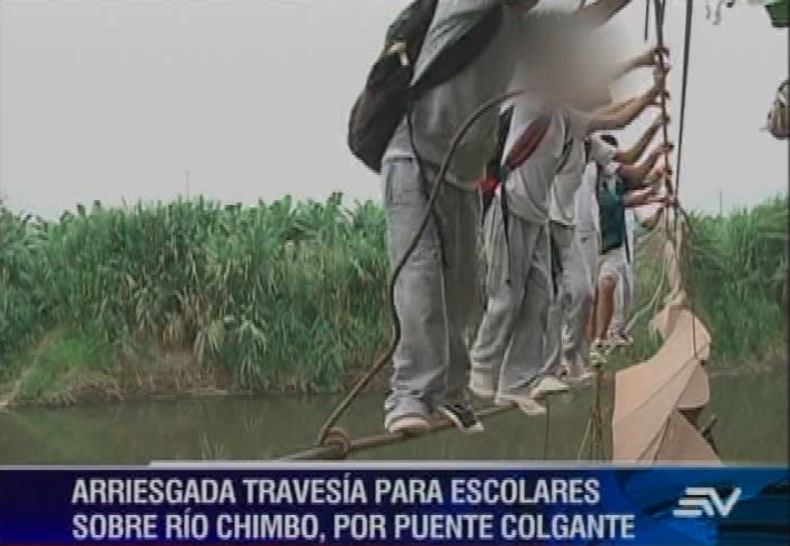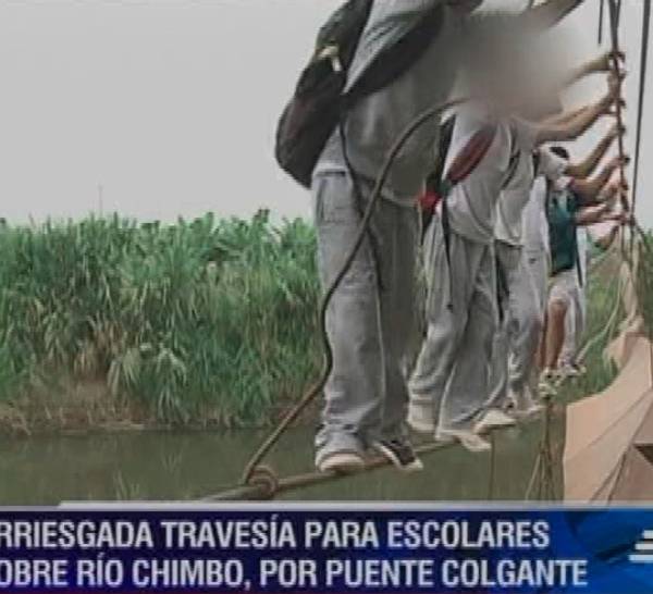 Con el corazón en la mano, así viven varias familias en los mencionados recintos. Para alcanzar un mejor porvenir y llegar a la escuela, los hijos de familias campesinas pobres deben cruzar el correntoso y peligroso Chimbo sobre el puente colgante de estructura metálica, cuyos templadores de acero cedieron por los más de 40 años de uso. Eleana Medina es una de las tantas madres que habla de sus angustias.