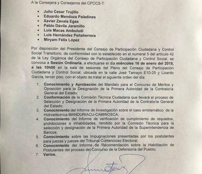 El futuro de la Contraloría General del Estado se conocerá finalmente este 17 de enero de 2019. El Consejo de Participación Ciudadana y Control Social (CPCCS) transitorio, en su sesión de este 16 de enero, aprobó por unanimidad realizar una declaración conjunta desde el Palacio de Gobierno.