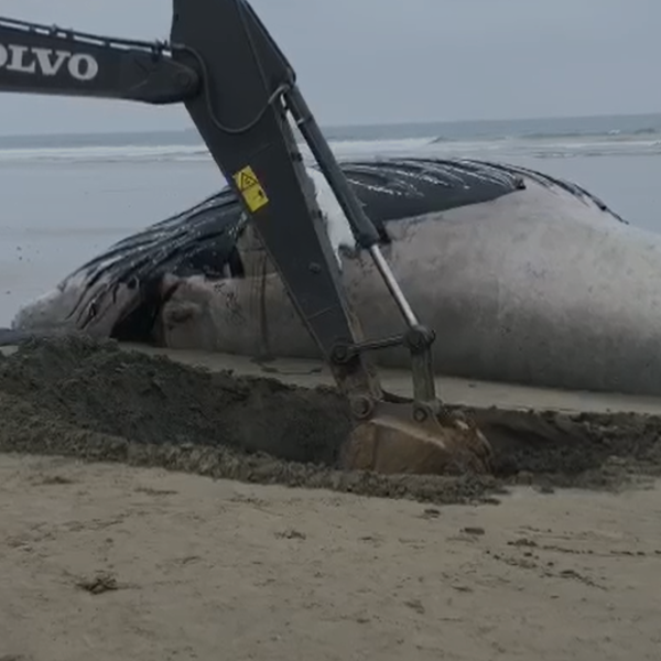 El cuerpo de una ballena jorobada que apareció la noche de este jueves 14 de julio en la playa de la comuna Olón, en la provincia de Santa Elena, fue sepultado este viernes, con ayuda de maquinaria pesada, en ese mismo balneario.
