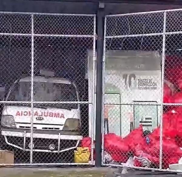 Tiene 54 años y el desgaste estructural es evidente. Las paredes, ventanas y pisos muestran el deterioro. En la parte posterior, camillas, bancos y escritorios están apilados junto a cuatro ambulancias inoperativas.