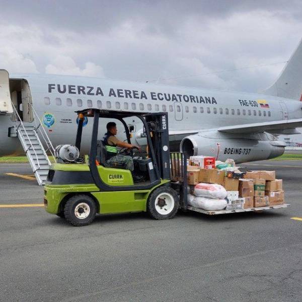Alimentos perecibles, medicinas y desayunos escolares son parte de la carga transportada en un avión de la Fuerza Aérea Ecuatoriana.