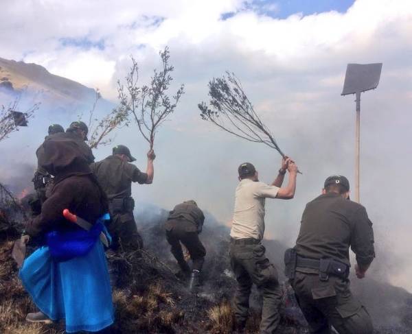 De acuerdo a Carlos López, jefe de Bomberos del cantón, el fuego alcanzó un reservorio natural de agua y perjudica a aves, conejos y a toda la fauna andina que habita en el área.