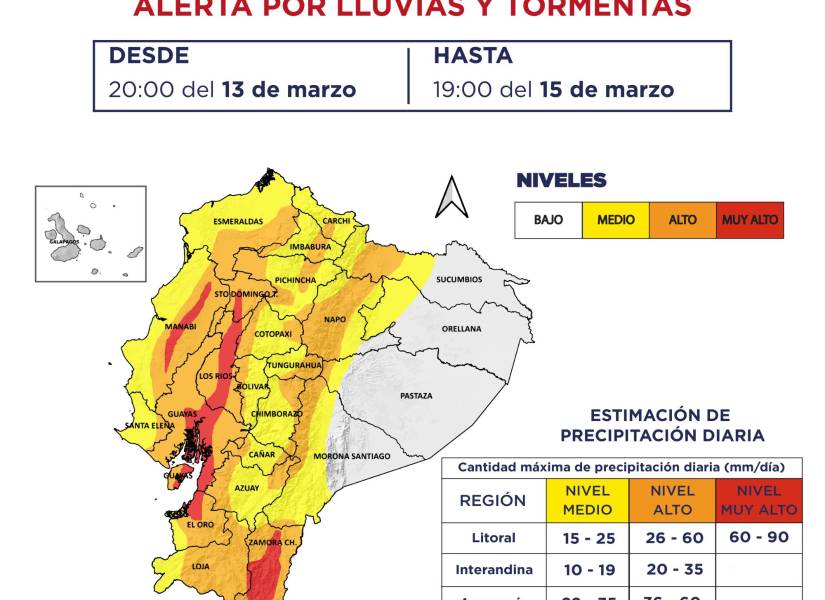 La alerta emitida por la institución, a cargo del monitoreo de las condiciones climáticas, desde las 20:00 de este 13 de marzo hasta las 19:00 del 15 de marzo se estiman niveles entre medios y alto de precipitaciones en la Sierra, Amazonía y Costa; pero solo en esta última podría llegar a un nivel 'muy alto'.