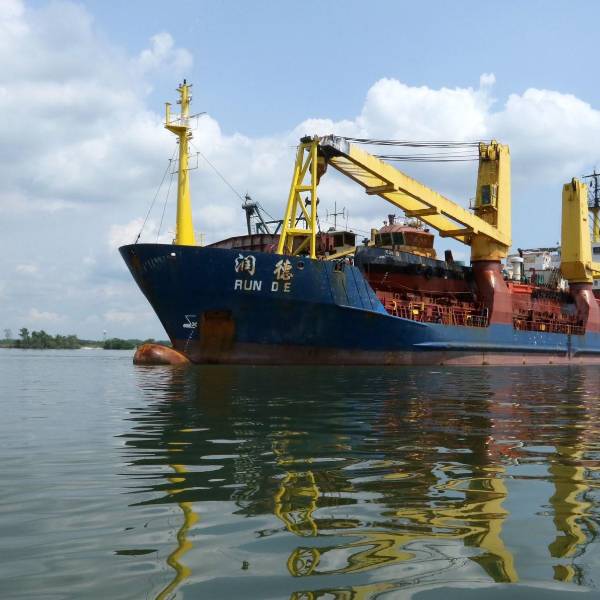 Imagen del barco Run De antes de entrar al puerto de Guayaquil. Aquí llega la maquinaria para dragar el islote El Palmar en el río Guayas.