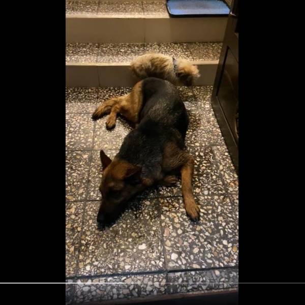 Cueva contó en su cuenta de Twitter que el perrito más pequeño no podía levantarse bien, ya que tenía lastimadas sus patas traseras. Pero la peor parte se llevó su otra mascota, un pastor alemán, más grande y pesado, que quedó inmóvil en las escaleras.
