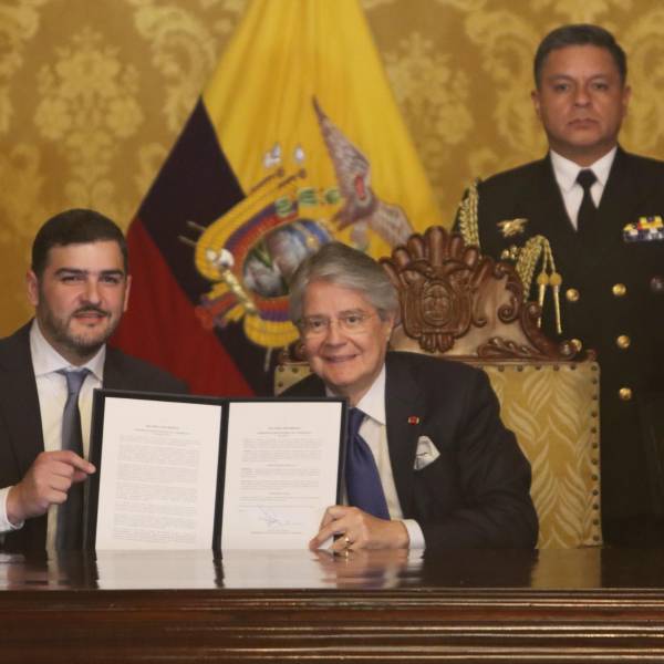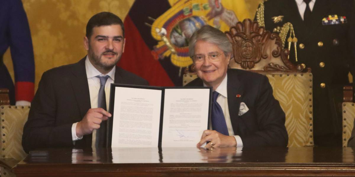 El presidente Guillermo Lasso firma el decreto ejecutivo que transfiere la competencia del quinto puente de Guayaquil a su Municipio, en el Palacio de Carondelet, junto al alcalde Aquiles Álvarez.( )