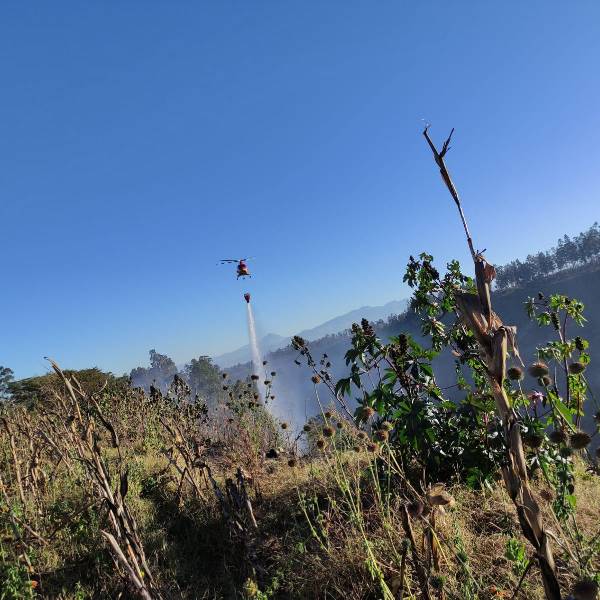 Se utiliza el helicóptero para lanzar agua, mientras los bomberos controlan el incendio por tierra.