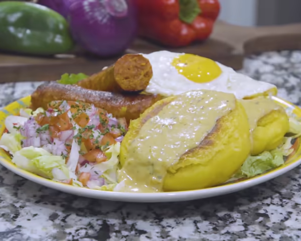 Imagen de un plato de llapingacho servido con salsa de maní, chorizo, salsa de cebolla, y un huevo frito.( )