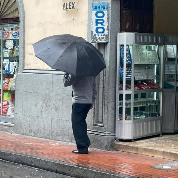 Un hombre camina con paraguas en la calle Olmedo del Centro Histórico durante la lluvia. ( )