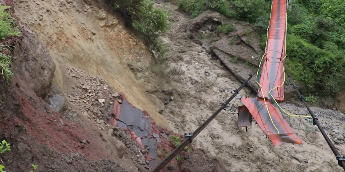 La fuerza del agua arrasó con un tramo de la carretera y un puente peatonal se destruyó. Afortunadamente no se reportan heridos.