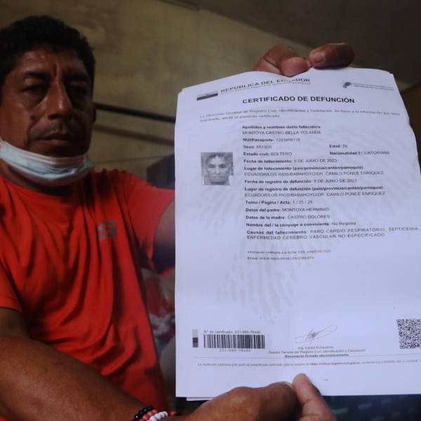 Gilbert Barbera Montoya pide que se anule el acta de defunción para que su madre para que pueda ser reincorporada a la lista de los beneficiarios del Bono de Desarrollo Humano, una ayuda económica (de 55 dólares) que entrega el Gobierno a personas de escasos recursos.
