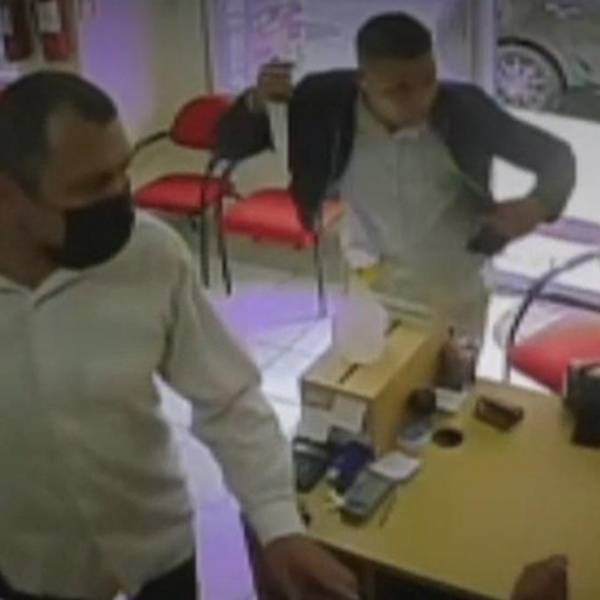 En las imágenes se observa a un hombre que ingresa a un establecimiento de alquiler de vehículos fingiendo ser cliente. El empleado lo atiende y afuera se observa a otro individuo que se detiene en la puerta e ingresa. El primero saca de su mochila un cuchillo y amenaza al dependiente. El otro lo amedrenta con un arma de fuego. Recorren el lugar e incluso cuando se percatan de la cámara de seguridad la tapan.