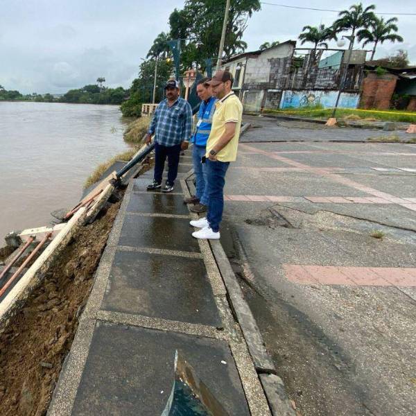 Una parte del malecón de Nobol, provincia de Guayas, quedó destruida este domingo 30 de marzo aparentemente por un socavón generado en la ribera por el aumento del río Daule.