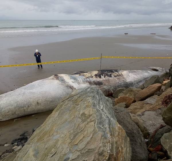 Trabajadores de la zona colocaron una cinta alrededor de la ballena, que tendría unos siete metros de largo.
