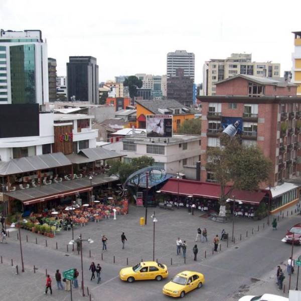 Seguimos nuestro camino por la principal arteria de La Mariscal, la avenida Amazonas, que cruza todo el barrio de norte a sur. Subimos a la terraza de uno de los primeros hoteles que tuvo el sector para apreciarla desde lo alto.