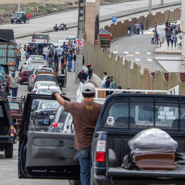 Gente que transporta féretros en espera en línea afuera del cementerio Jardines de la Esperanza en Guayaquil. Foto: AP